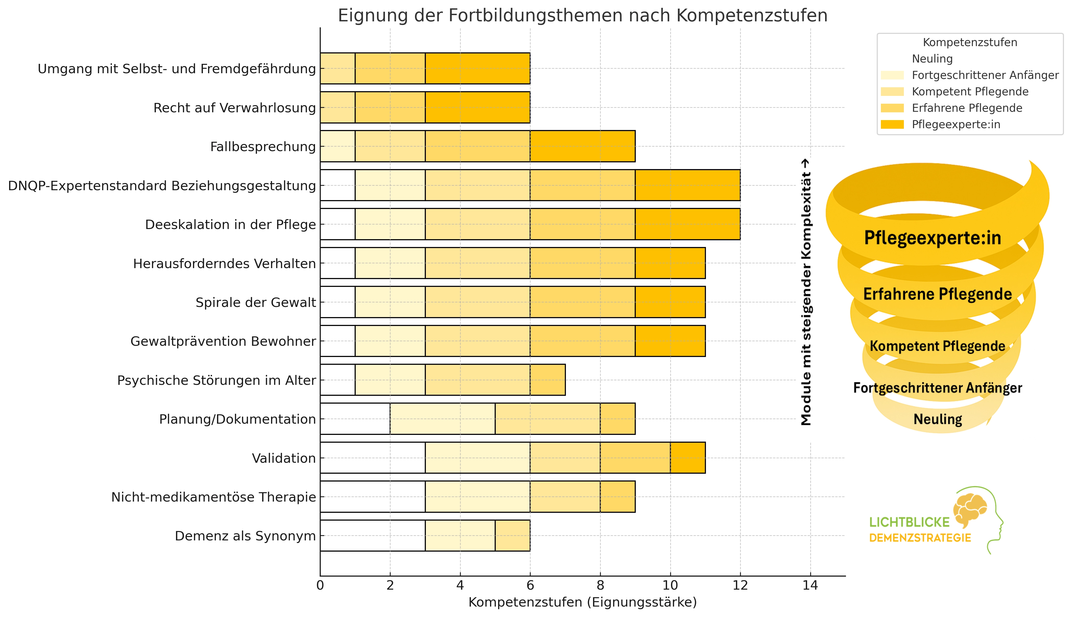 Das Kompetenzstufenmodell nach Patricia Benner beschreibt die Entwicklung von Pflegekräften in fünf Stufen: Neuling, Fortgeschrittener Anfänger, Kompetent Pflegende, Erfahrene Pflegende und Pflegeexperte/in. Jede Stufe spiegelt ein wachsendes Maß an Wissen, Fähigkeiten und professionellem Urteilsvermögen wider. Das Modell bietet Pflegeeinrichtungen einen strukturierten Ansatz zur gezielten Förderung und Entwicklung ihrer Teams durch passgenaue Schulungen.